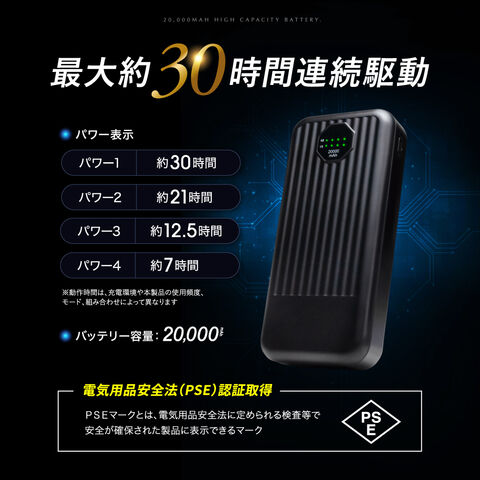 17V/20,000mAhの高出力で連続使用時間 最大30時間可能。