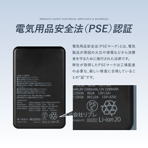 なお、付属のモバイルバッテリーはPSE認証(電気用品安全法に基づく適合性検査)を受けており、基準に適合した製品であることを示すマークが表示されています。