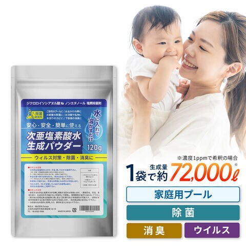 【ポイント大増量】除菌研究所 次亜塩素酸水生成パウダー 120g 濃度500ppm 144リットル分 ジクロロイソシアヌル酸 消臭 プール除菌剤 塩素除菌剤【軽量スプーン2本付】詳細説明書付 スプレー 超音波加湿器 家庭用プール 日本製