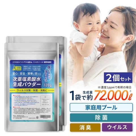 【ポイント大増量】【2袋セット】除菌研究所 次亜塩素酸水生成パウダー 120g 濃度500ppm 144リットル分 ジクロロイソシアヌル酸 消臭 プール除菌剤 塩素除菌剤【軽量スプーン2本付】詳細説明書付 スプレー 超音波加湿器 家庭用プール 日本製
