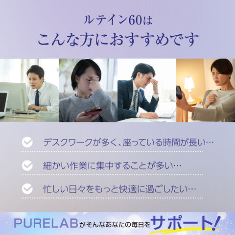 PURELABは、1日2粒あたりルテイン60mgとゼアキサンチン3mgを配合。