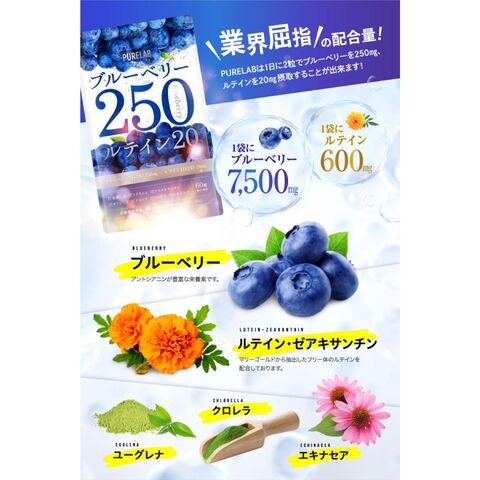 【ポイント大増量】PURELAB【ブルーベリー ルテイン サプリ】サプリメント (栄養機能食品 ビタミン B2 B6 B12) ブルーベリー 250mg ルテイン 20mg アントシアニン ルテイン ゼアキサンチン アサイー アスタキサンチン 亜麻仁油