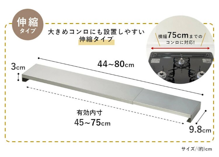 排気口カバー 伸縮式 スライド フラット ステンレス シルバー 薄型 45cm〜60cm~75cm ガスコンロ IH グリル 掃除 油汚れ 防止 ガード キッチン おしゃれ シルバー