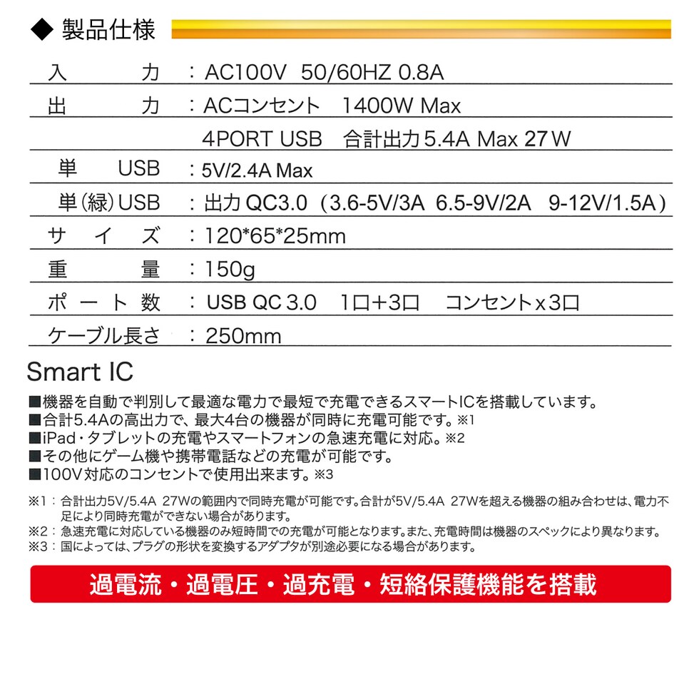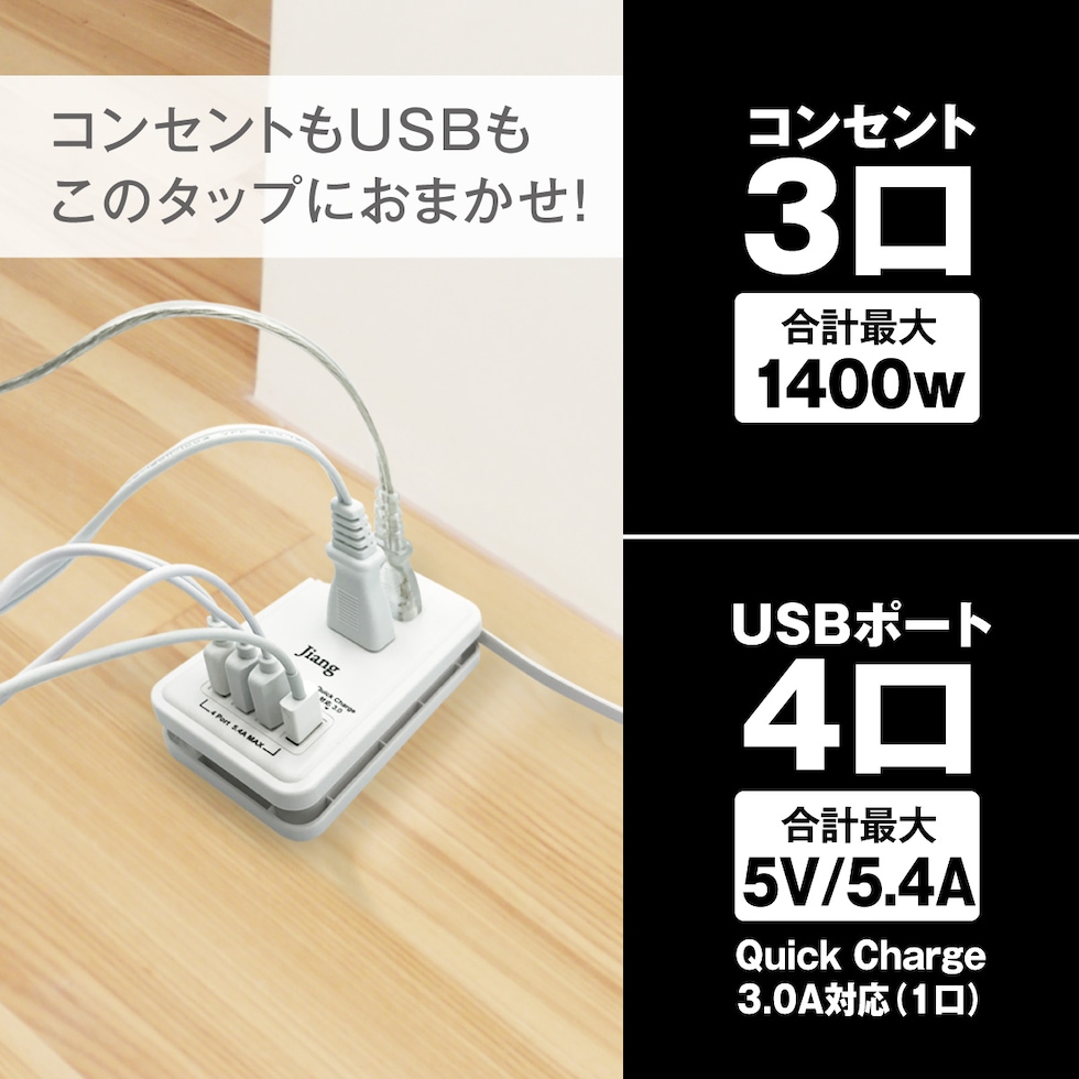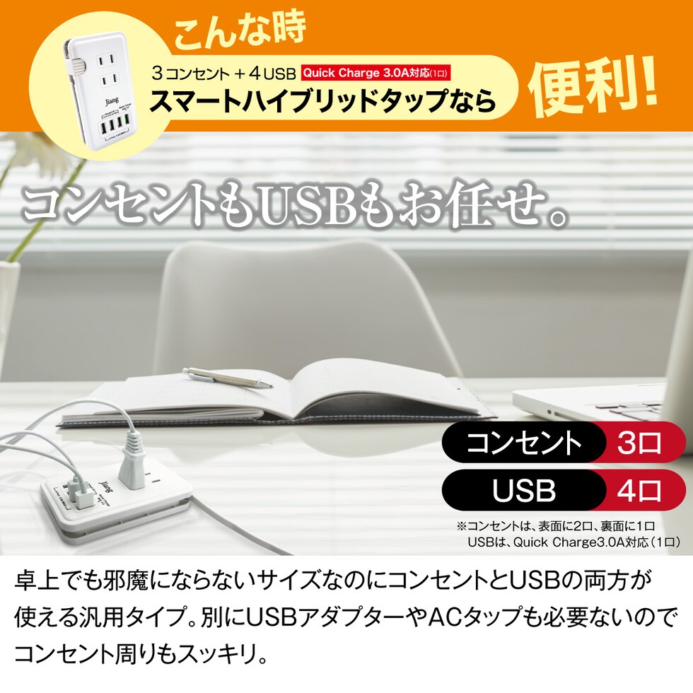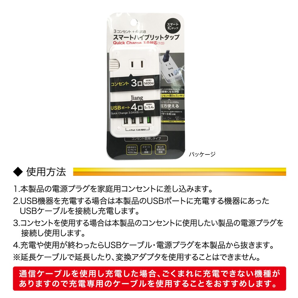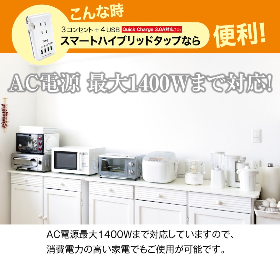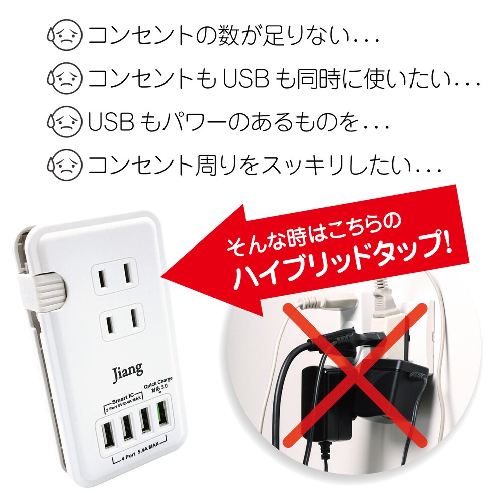 スマートタップ ACアダプター AC アダプター USBタップ USBアダプター ハイブリットタップ 急速 コンパクト 同時充電 タップ 4ポート AC&USB 4口 5.4A 充電器 チャージャー USB充電器 コンセント 3口 1400W 電源タップ 軽量 スマホ充電器 Quick Charge