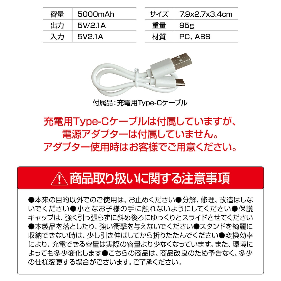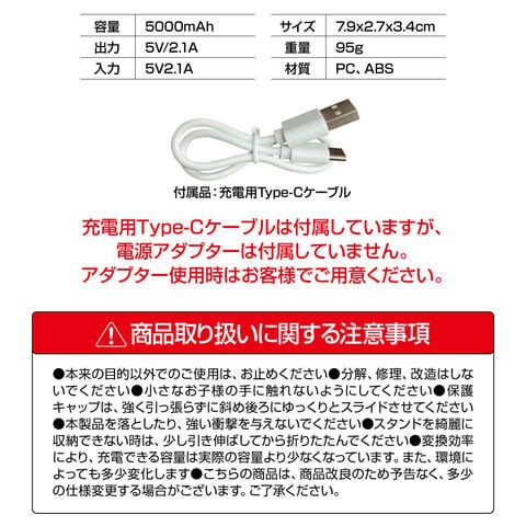 【5000mAh】サイズはコンパクトでも、容量は5000mAhの大容量。コンパクトタイプのバッテリーでも実用的な容量になっています。
