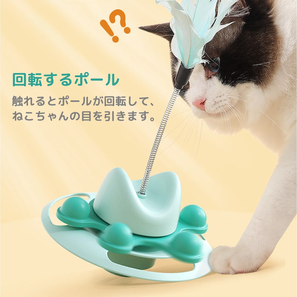 【回転するボール】触れるとボールが回転して、ねこちゃんの目を引きます。