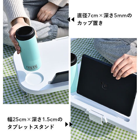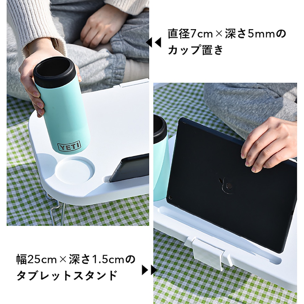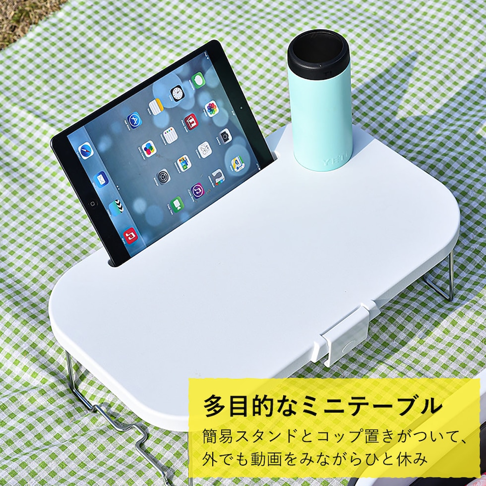 【多目的なミニテーブル】簡易スタンドとコップ置きがついて、外でも動画を見ながらひと休み。