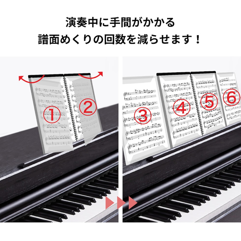 演奏中に手間がかかる譜面めくりの回数を減らせます。