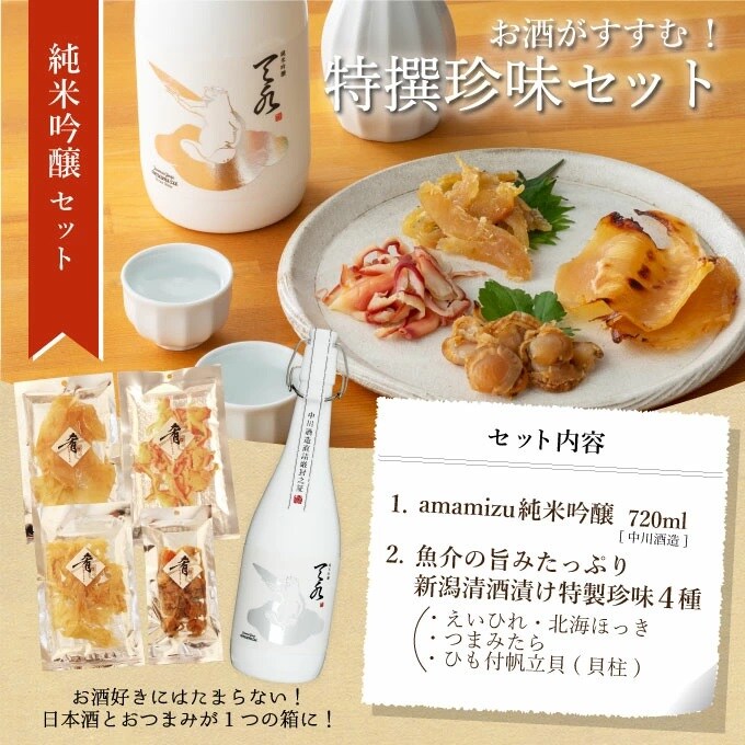 お酒 ギフト お歳暮 お年賀 日本酒 おつまみセット ギフト 純米吟醸【amamizu】720ml×清酒漬け珍味4種セット プレゼント 男性 女性 上司 新潟地酒 誕生日 内祝い お返し 結婚祝い 出産祝い お酒 高級 おすすめ 化粧箱入り 記念品 お祝い 贈り物 風呂敷包装 化粧箱入り 辛口