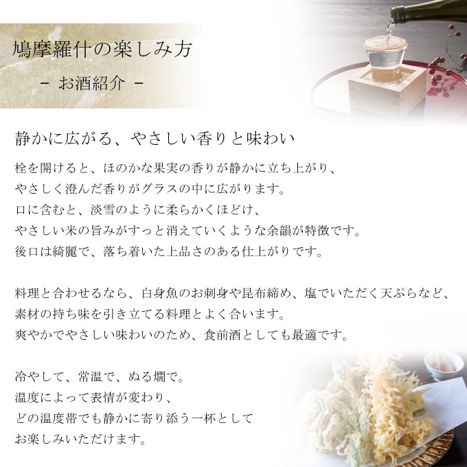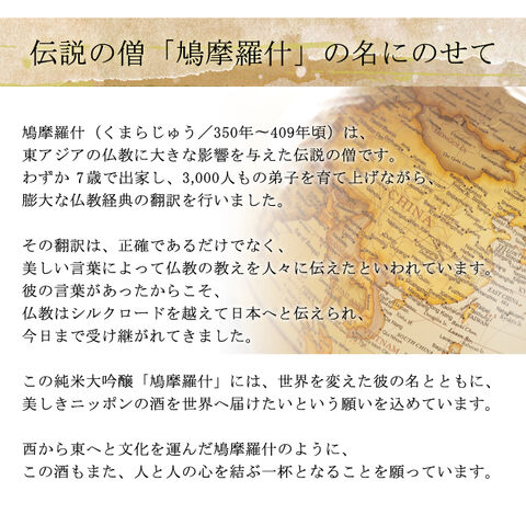 このお酒の名前である鳩摩羅什(くまらじゅう)とは、中国の南北朝時代初期に仏教経典を訳し、仏教文化において多大なる影響を与えるに至った伝説の僧の名前です。彼の名を付けたこのお酒は、世界に多大なる影響を与えた鳩摩羅什の名のもとに、美しきニッポンの酒(SAKE)を世界中に知ってほしいとの心内から純米大吟醸『鳩摩羅什』と名付けられました。