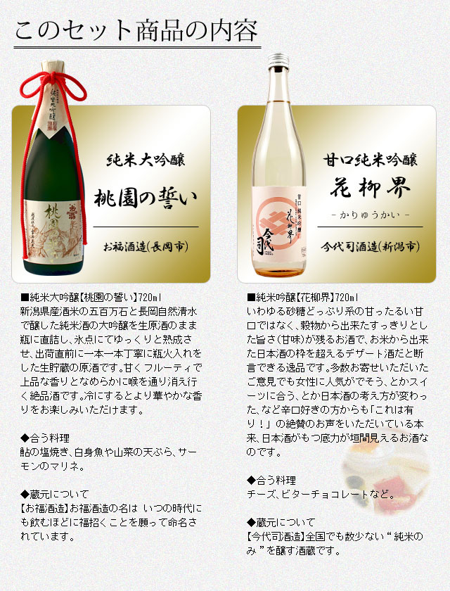 日本酒 飲み比べ お酒 ギフト 御歳暮 プレゼント 純米大吟醸【桃園の誓い】×純米吟醸【花柳界】720ml 2本セット退職祝い ギフト プレゼント 男性 女性 上司【 新潟地酒 誕生日 内祝い お返し 結婚祝い 出産祝い 贈り物 お酒 送料無料】