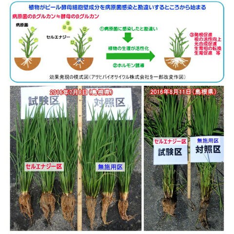 ●ビール醸造後の酵母から調整した細胞壁(βグルカン)を製品化した本資材は、植物が本来持っている力を引き出す効果があることが、 アサヒグループホールディングス株式会社の研究を基にわかってきております。