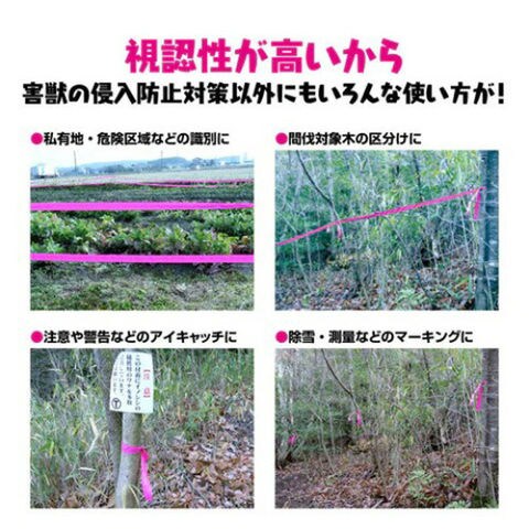 - ●視認性に優れているので、害獣対策以外にも間伐対象木の区分け、除雪・測量などのマーキング、私有地などの識別・バリケード等さまざまな使い方ができます。