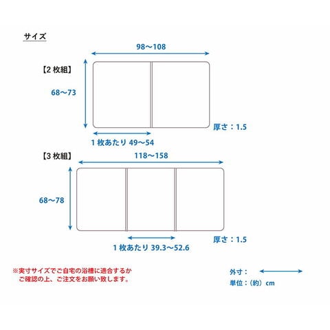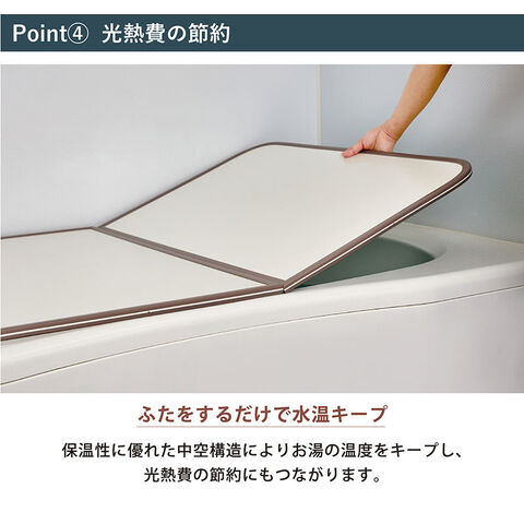 | 商品説明 | UV加工・防カビ加工を施した組合せ風呂ふたです。 幅68~78cm、長さ98~158cmの14サイズから選べます。 2枚または3枚組で、軽く扱いやすい! フチには防カビ加工で、カビになりにくく、本体はUV加工で、日焼けしにくいので変色を防ぎます。 フラットな形状でお手入れしやすく、衛生的です。 【注意事項】 ・風呂ふたを洗うときには中性の浴室用洗剤を使用してください。 ・24時間風呂ではご使用はお避けください。 ・風呂水洗浄剤(塩素殺菌剤)をご使用はしないでください。 ・市販の入浴剤や温泉水等により変色する場合があります。 ・柑橘類等(ユズ・ミカン・レモンなど)を使用しますと風呂ふたを傷める恐れがあります。 ・ベビーバス等を風呂ふたにのせて使用しないでください。 ・製品の特性上 幅±5mm 長さ±10mm 誤差が生じる場合がございます。 【配送について】 詳しくは配送についてをご確認お願い致します。 詳細はこちら |