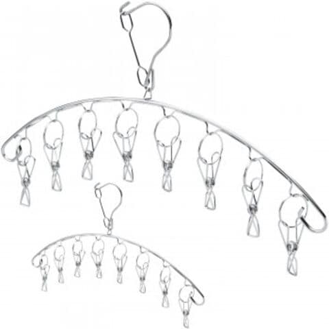 | 小物を省スペースに干せるステンレスハンガー。ハンガー1本分のスペースに干せるので、一般的な角ハンガーに比べ省スペース。ハンカチ・ふきん・くつ下など小物の洗濯が多い方や、一人暮らしで洗濯物の量が少ない方におすすめ!洗濯物のすき間やカーテンレールにかけて部屋干しなどスッキリ干せます。型くずれしやすいキャップやクローゼットの小物収納にも◎落下防止フック付。1本につきピンチ8個付き、2個組。ステンレス製。 |