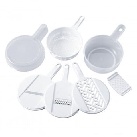 3種の調理プレート(おろし・スライス・千切り)、フタ、ボウル、ザル、安全ホルダー