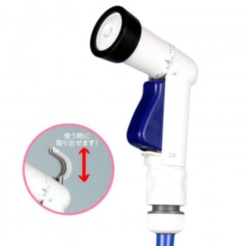 | 仕様 | ホース適応サイズ:外径20mmまで、内径12~15mm 引っ掛けられるバケツのサイズ:5~25号 (※約20mm位まで、製品・形状により挟めない場合もあります。) シャワーの穴:221ケ |