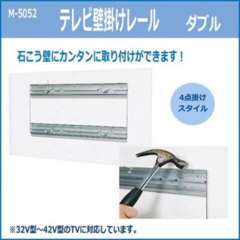 | テレビ背面のビスをレールに掛けるタイプのj金具です。4点掛けスタイル。 取付け方法 (1)テレビに連結バーを取り付けます。 (2)壁に本体レールを取付け本体レールにテレビを引っ掛けます。 |