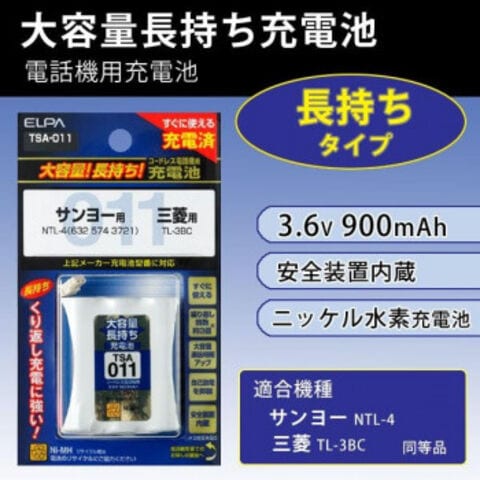 | 仕様 | 適合機種 ・サンヨー:NTL-4(632 574 3721) ・三菱:TL-3BC 同等品 電話機用 3.6V 900mAh ニッケル水素充電池(充電済) |
