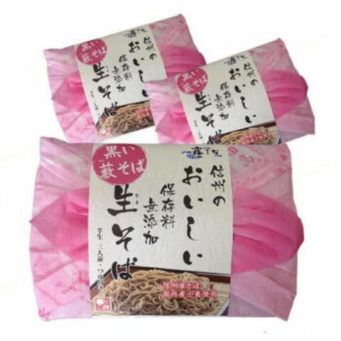 信州の生そばとつゆのセットです。そばは保存料無添加の「黒い藪そば」。細麺でありながら、コシがあり、のど越しにこだわりました。風呂敷包みのセットになっているので自宅用はもちろん、ちょっとした手土産にも最適です。