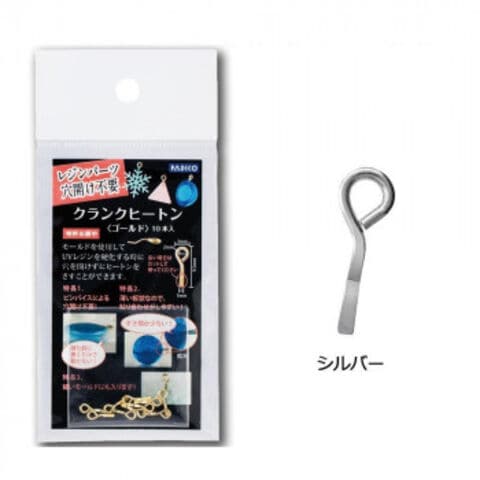 | 使いやすくなったヒートンが新登場。モールドにUVレジンをいれ、硬化する前にクランクヒートンを埋め込み、そのまま照射するとクランクしている部分がレジン内部に適度に埋まり穴を開けなくてもヒートンを刺すことができます。 |