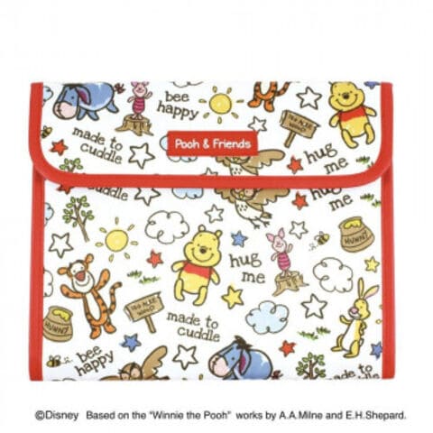 | らくがきタッチのプーさん達が可愛いマルチケース。テープ式で開け閉めしやすく、13×18cmサイズの母子手帳やカードをまとめて収納できます。 |