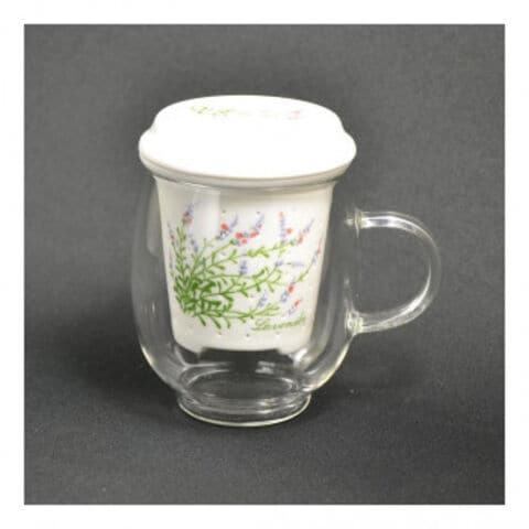 ガラスのマグカップに陶磁器の茶こしと蓋をセットしました。茶こしは底部が三つ脚になっており、マグカップに茶こしの脚を引っ掛け、熱いお茶の湯切りをすることができます。蓋は裏返すと茶こし受けとしてもご使用いただけます。ギフトにも最適♪