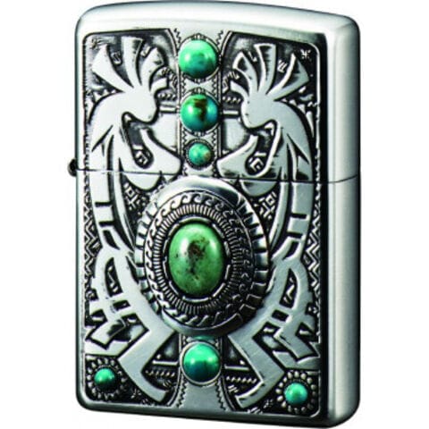 北米大陸の南西部を中心としたヘ?トロク?リフ(岩絵)にその姿を数多く刻まれ、様々な実りをもたらしてくれると言われている、カチーナ(精霊)の一人「ココペリ」をイメージしたデザインのジッポーです。