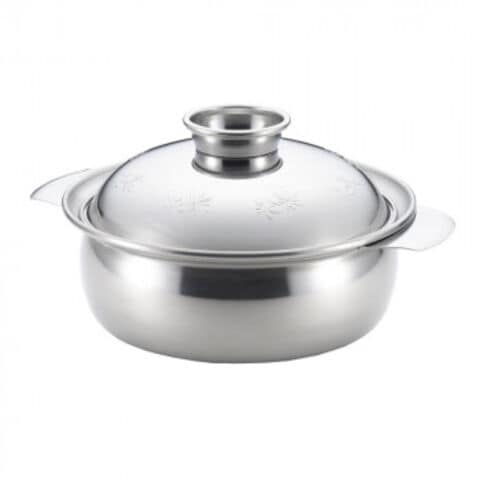 ガス火もIHも使える、土鍋のような形のステンレス鍋。フタにはもみじの模様が入っています。