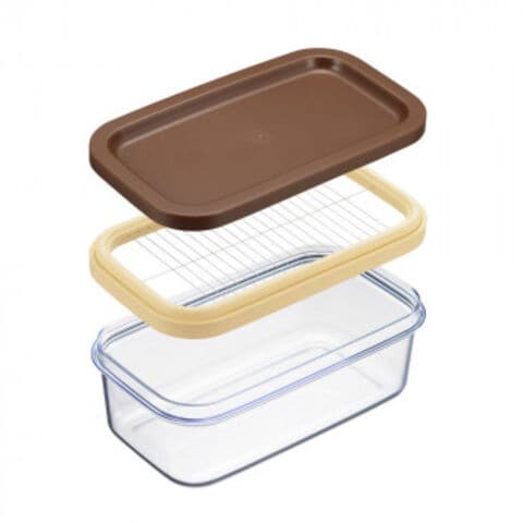 | バターをワイヤープレートにのせて、ふたでギュッと押せば約5gのうす切りが完成です。フタをして冷蔵庫にそのまま保存可能なので便利です。 |