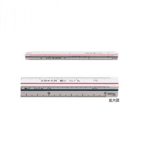 | 仕様 | 目盛り長:15cm 副尺なし 【縮尺目盛り】 1/50の70.7%、1/100の70.7%、1/200の70.7%:A列対A列縮小 1/50の86.6%、1/100の86.6%、1/200の86.6%:A列対B列縮小 |