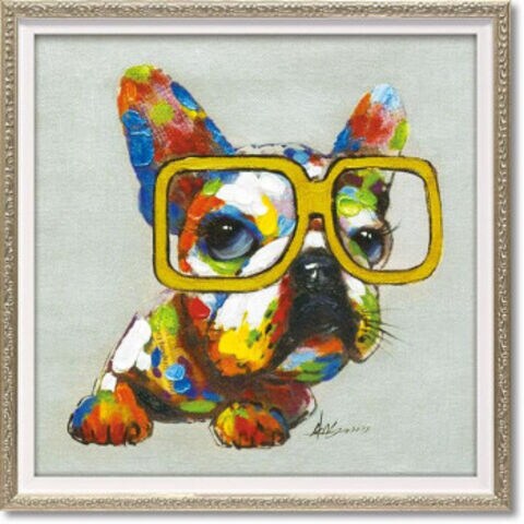 | カラフルにハンドペイントされたキャンバスをリッチなフレームにセットしたモダンアートです。飾る場所を選ばない小型サイズ。 |