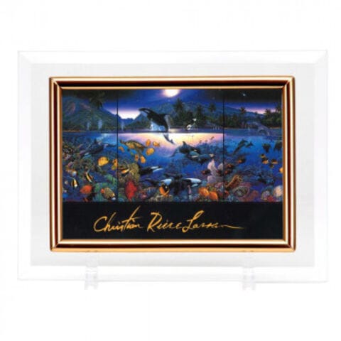 | クリスチャン・リース・ラッセン(Christian Riese Lassen)が描いた、深みのあるブルーを基調に鮮烈な色彩の調和で見るものを惹きつける絵をセットした、透明感が美しいクリスタルフレームです。透明なガラスのフレームがラッセンの絵を引き立てます。 |