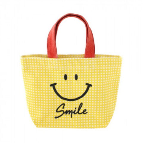 | 丈夫なキャンバス生地にかわいいスマイルを刺繍しました。今日もにっこりスマイルで出かけよう!ちょっとしたお出かけや散歩、お弁当入れにぴったりです。 |
