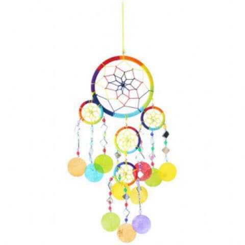 | カラフルなカピス貝やミラーワークなど、キラキラ・カラフルなパーツで作ったドリームキャッチャー。揺れるたびにカピス貝が奏でるカラカラという音が心地よいです。 |