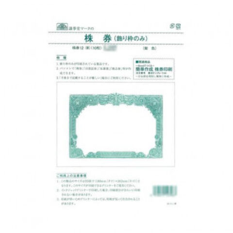 | パソコンで「株券」「出資証券」「私募債」「商品券」等が作成できます。「手書きで記載することが難しい」場合にご利用ください。 【ご利用上の注意事項】 この製品のサイズはB5別寸(タテ188×ヨコ266mm)となります。このサイズが印刷できるプリンターをご使用ください。 インクジェットプリンターで印刷した場合、印刷部分がきれいに印刷されない場合があります。 用紙が厚いため、プリンターによっては、用紙が反って出力されることがあります。 |