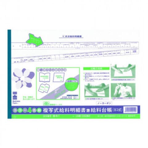 | 1冊で200名分が計算できるヨコ型の給料計算用紙です。1枚は切り離して各人の給与明細に、1枚は記録台帳とします(ヨコ型ヨコ書き、10名連記、手当欄8、控除欄3)。 |