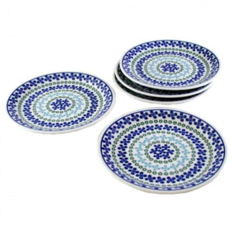 花冠・花飾りを想わせる、大小の小花がリズミカルに並んだ可愛いシリーズ。ブルーとグリーンの落ち着いた色調だから、毎日のテーブルで大活躍。