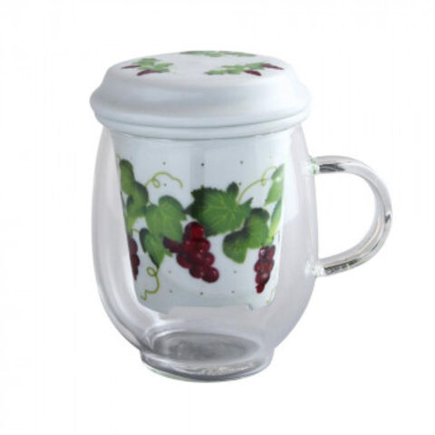 ガラスのマグカップに陶磁器の茶こしと蓋をセットしました。茶こしは底部が三つ脚になっており、マグカップに茶こしの脚を引っ掛け、熱いお茶の湯切りをすることができます。蓋は裏返すと茶こし受けとしてもご使用いただけます。ギフトにも最適♪