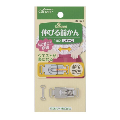 ホック部分が約1.5cm伸びるのでウエストがとまりにくい服や、座る時にウエストがきつい服に付け替えると、ウエストが楽になります。ロック機構付きで、はずれにくくなっています。 |