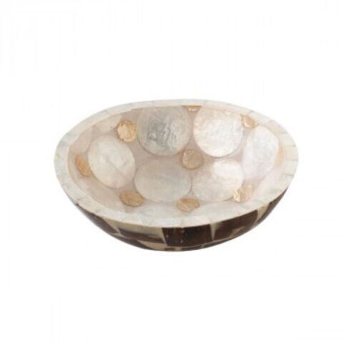 ココナツのトレイに光沢のあるシェルを丸く、薄く削りあしらったトレイ。ゴールドのドットシェルがアクセントに。シェルの輝きが綺麗です。