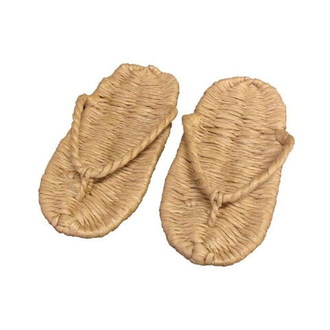 わら草履と違い、わらくずが出ないので室内履きにお勧めです。夏場の蒸れる時期には特に蒸れなさを実感できます。耐水性を強化した和紙紐で編んでいますのでお茶会での移動の際にも使えます。手編み製品により若干の大小がございます。 |