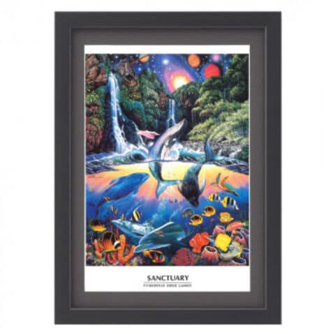| 黒いフレームの中に黒マットが付いたフレームで、ラッセンの美しいポスターを引き立てます。 |