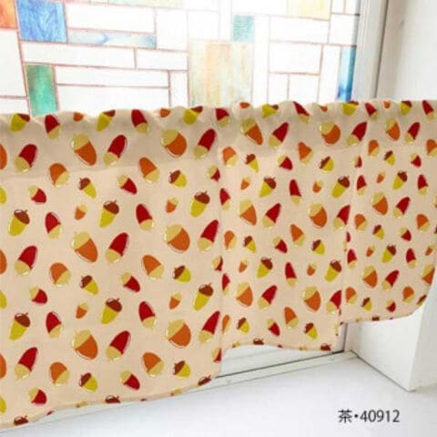 どんぐりがたくさんデザインされたポップで可愛らしいカフェカーテンです。