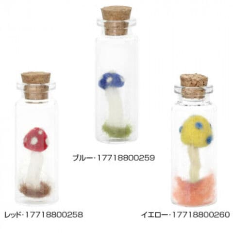 | 小さなボトルにフェルトのキノコを入れた可愛いボトルです。窓辺やデスクにちょこんと飾りたい、1つ1つ手作業で作られるフェルトアイテム。フェルトは動物の毛を広げて石鹸水などを含ませて、もんだり巻いたり転がしたりすることで作られます。 ※1つ1つ手作りのため、色合いやサイズに個体差があります。ハンドメイドならではの風合いをお楽しみください。 |