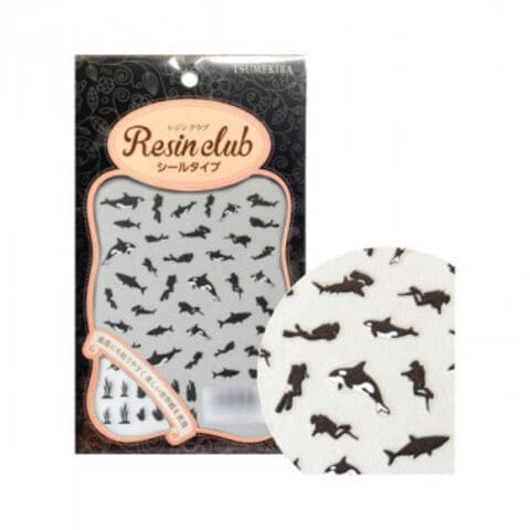ダイバーやサメ、シャチなどのシルエットがデザインされたレジンシールです。組み合わせると海の中をイメージしたデザインが仕上がります。