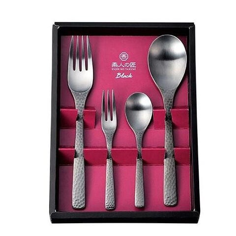 | 匠の技が冴えわたる、陰影が際立つ漆黒のカトラリー。黒色酸化発色を施しており、塗装やメッキと違い剥離する恐れがありません。 【セット内容】 コーヒースプーン×1本:全長約120mm ヒメフォーク×1本:全長約124mm デザートスプーン×1本:全長約180mm デザートフォーク×1本:全長約182mm |
