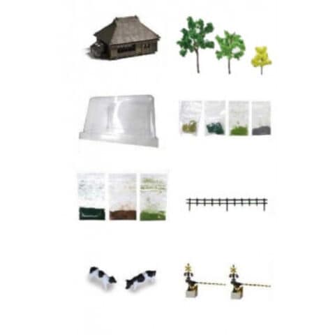 | セット内容 | トタン屋根農家×1個 透明防塵カバー×1個 パウダー(濃緑、緑、黄緑)×各1袋 牛×2頭 樹木(濃緑、緑、黄緑)×各12本(計36本) フォーリッジ類(濃緑、緑、黄緑)×各1袋 バラスト(灰色)×1袋 柵×1個 踏切(日本型)×2個 |