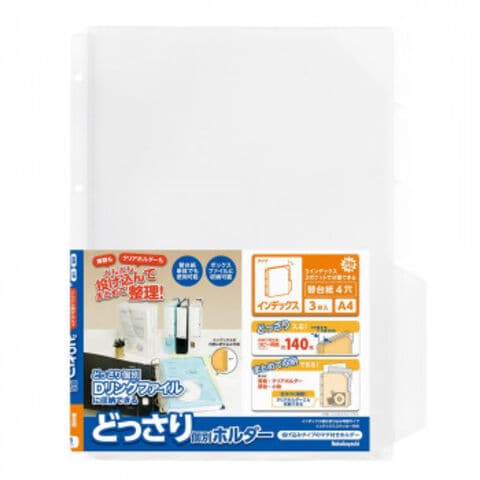 | 厚物・小物も収納できる投げ込みタイプのマチ付きホルダーで、3ポケットで分類ができます。インデックス部分が内側に折込み可能になり、持ち運びにも便利です。どっさり個別専用Dリングファイル(別売り)にそのまま保存ができます。 ※どっさり個別Dリングファイル(RF1035)の専用替台紙です。他のファイルには対応しておりませんのでご注意ください。 |