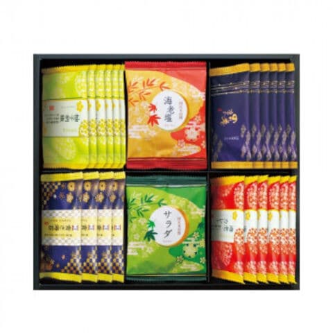 | セット内容 | のり巻あられ×6枚、柚子胡椒煎餅×6枚、海老カレー煎餅×6枚、青さ海苔煎餅×4枚、海老塩煎餅×3枚、サラダ煎餅×3枚 |